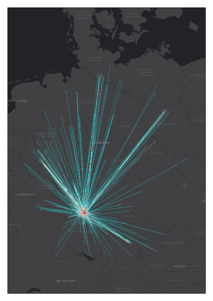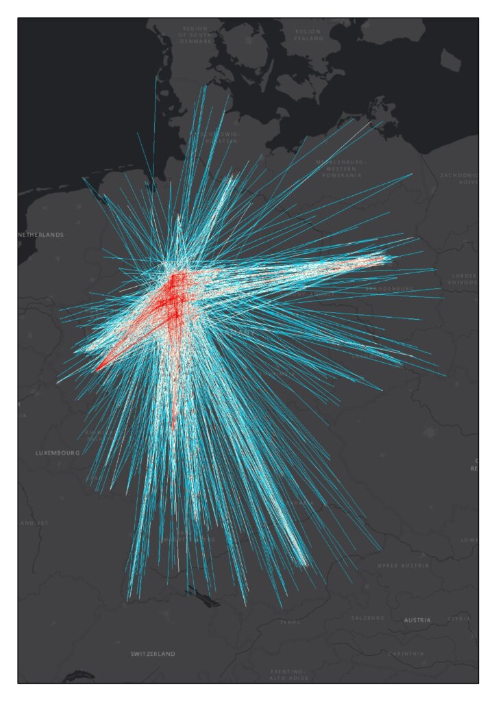 The ” Digital Layer” approach was proposed by Miriam Krüger and her colleagues as an alternative method for analyzing company networks (Krüger, Miriam, Jan Kinne, David Lenz und Bernd Resch, 2020, The Digital Layer: How Innovative Firms Relate on the Web) and is being further developed by istari.ai. Unlike previous approaches, it uses digital mass data to identify and analyze business networks. Companies, like all other economic actors, are progressively leaving digital traces of their activities. This can be in the form of posts on social media platforms, references in news articles or on the company’s own website. This ” Digital Layer” can be used to identify relationships between companies and examine the networks thus exposed. For example, the figure below shows the locations of more than 600,000 companies in Germany, their degree of innovation (calculated using webAI InnoProb) and about seven million hyperlink connections between their corporate websites.