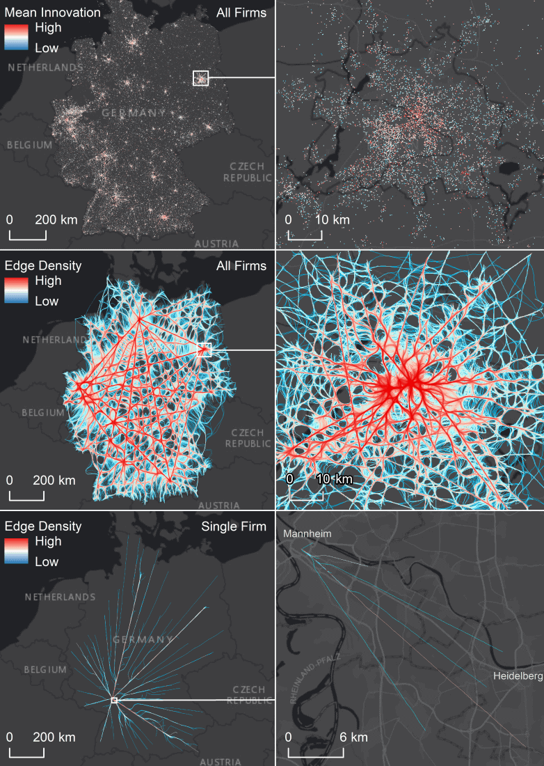 Image1: Digital Layer for Germany: Locations and InnoProb scores for over 600,000 companies in Germany and Berlin (top); approximately seven million detected hyperlink connections between company websites in Germany and Berlin (middle); national and regional hyperlink network of a single company (bottom). Source: Krüger et al. 2020.